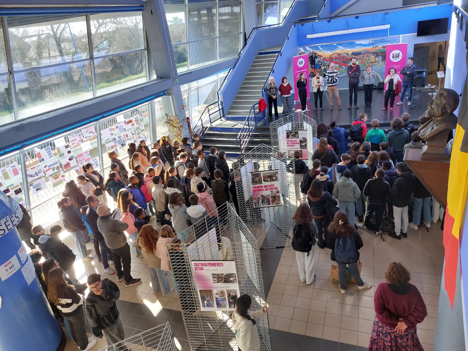 En présence des professeurs belges Stéphane de Shutter et Naomi, et français Mesdames Durand et Lagar, Mesdames Eva Géraud et Elisabeth Claverie , représentantes du Département, Mr Debras , Président des Restos du Coeur du Tarn ainsi que Mme Tall ont inauguré l'exposition sur les 40 ans de cette association.